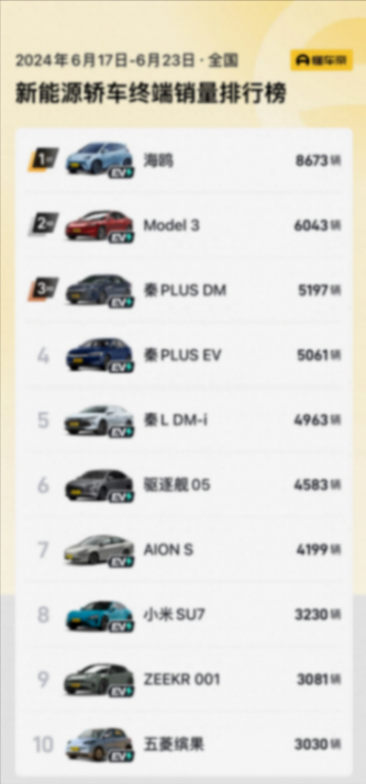 2024年第25周(6.17-6.23)各細分市場銷量排行,比亞迪轎車、SUV均占據半壁江山,MPV的騰勢D9 DM-i更是“遙遙領先”,理想汽車僅剩理想L6進入前十,小米SU7周銷再創新高,反超極氪001再次成為大中型純電轎車第一。