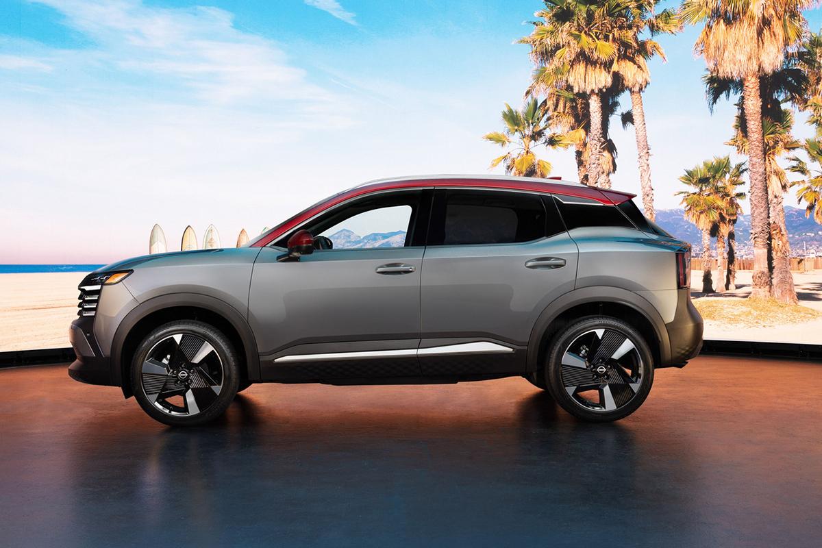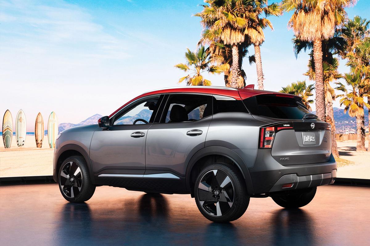 側面來看,短后懸的設計讓車身線條看上去非常流暢,懸浮式+雙拼色的車頂極具運動氣息,C柱開始上揚的線條為新車帶來不俗的肌肉感。相比車頭,全新日產勁客的車尾部分就顯得“正常”許多,尾燈點亮后的辨識度較高,銀色的后保險杠為整車增添不少質感。