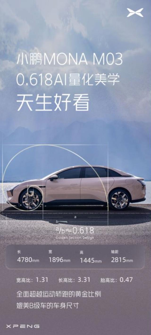 車身尺寸方面,小鵬MONA M03是小鵬MONA系列的首款車型。該車車長4780mm,車寬1896mm,車高1445mm在,軸距2815mm,比肩B級車,屬于一款中型純電轎車。不僅實現了3.31的長高比和1.31的寬高比,全面超越了運動轎跑的黃金比例。搭載的同級別唯一超跑同款的AGS全融合外置主動進氣格柵,在不同車速下,平衡優化風阻和電驅冷卻的需求,讓它擁有了更長的續航能力。