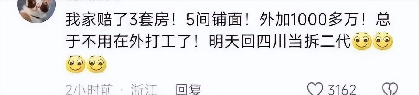 10月15日晚,很多四川成都網友開始在"小紅書"上分享近期各自的拆遷補償情況。有的家庭拆遷拿到900多萬,有的拿了17套房,還有三年房租。一夜之間,成都大規模拆遷話題火了,昨日#成都拆遷地圖上新#話題占據了微博的成都同城熱搜榜第一位。