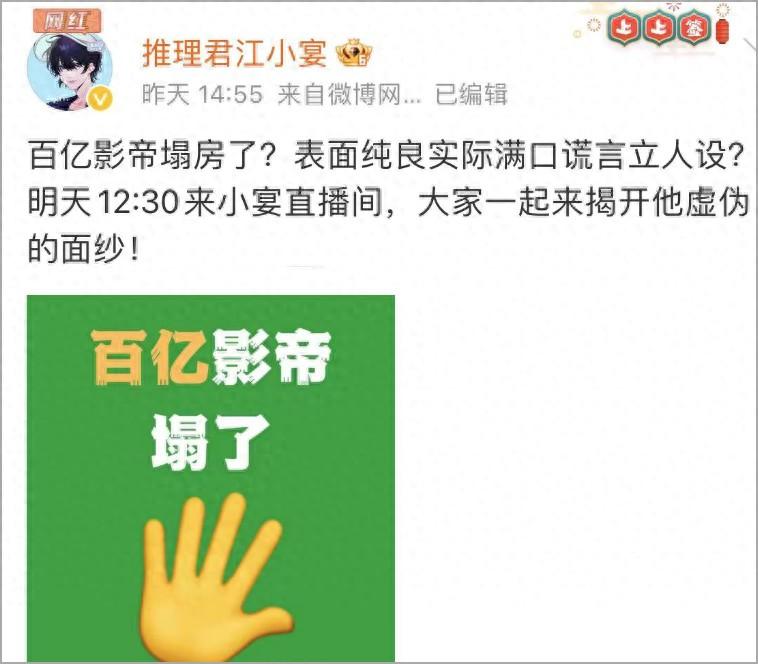 10月15日,推理君江小宴發出預告,爆料“百億影帝表面純良,實際滿口謊言立人設”,這瓜一出網友不淡定了,百億票房+影帝這兩條線索,就把范圍縮小了不少,都在討論這位“雙面人”到底是誰?