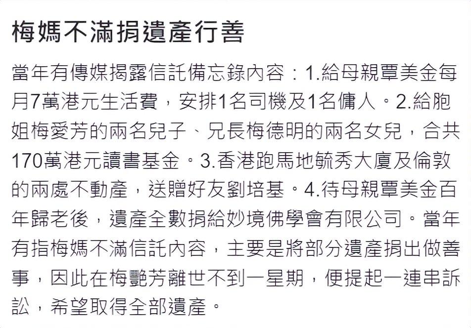 2009年聲稱生活苦悶,要從遺產里提取80萬去環球旅行;2017年又要求一次性取出7100萬,作為15年的生活費。2011年,梅媽和兒子梅啟明以信托基金沒能處理好遺產提出訴訟,要求對方賠償15億。