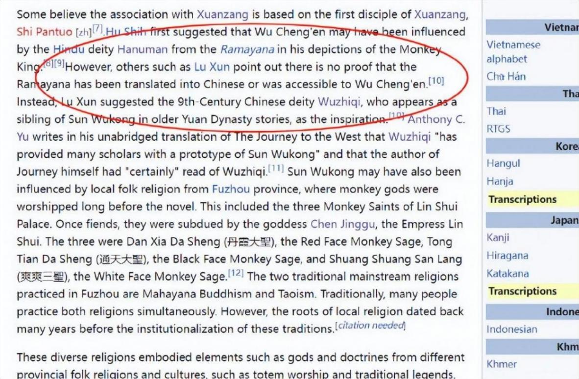 而在《黑神話》發售后,大概10月份,印度人就把這段編輯成了“現代學者普遍認為魯迅的說法是錯的。有大量研究證明哈努曼傳說傳到了中國”,然后說孫悟空的故事和哈努曼的故事非常接近,比起其他所有可能的原型都更接近哈努曼。大段大段哈努曼如何影響中國和亞洲其他國家,大段大段表明孫悟空原型一定是哈努曼