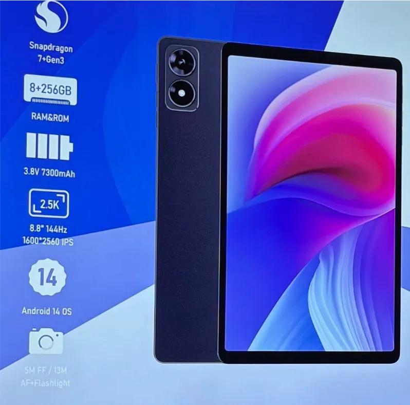 屏幕為8.8 英寸LCD屏幕,144Hz高刷,分辨率 2560×1600;處理器為高通驍龍7+Gen3;電池容量為7300mAh,支持 18W 有線快充。