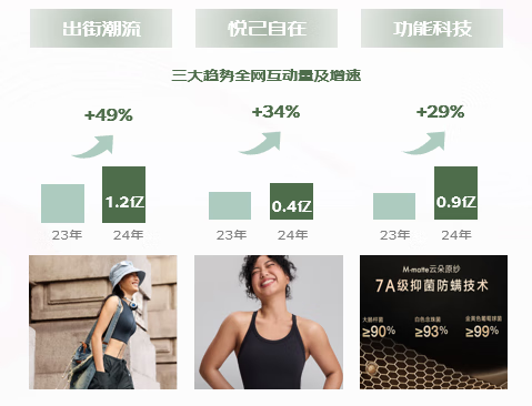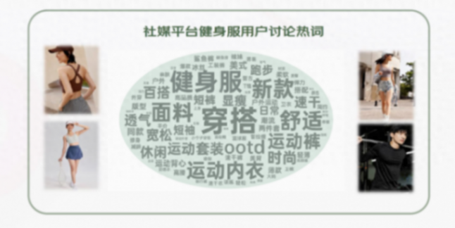 與此同時,健身服市場呈出街潮流化、悅己小自在、功能科技升級三大流行趨勢。就“出街潮流化”而言,隨著日常通勤、逛街、city walk、旅行等場景中健身服出現的頻率逐漸增多,越來越多的消費者追求流行設計元素和多樣化風格的服裝,滿足其將運動時尚風融入生活時刻的需求;而在現代快節奏生活中,消費者越來越追求松弛感,更傾向于穿著舒適、面料有質感且設計合身的衣物,呈現出“悅己小自在”的趨勢;而追求運動快樂的同時,消費者也享受“功能科技升級”帶來的體驗,戶外、工裝等流行元素備受歡迎,防震、透氣、提臀等功能的迭代也持續滿足消費者的需求,此外工藝的運用和升級帶來了新鮮感。