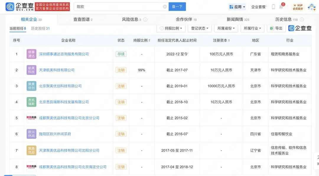 記者在企查查看到,目前陳歐共關聯39家企業,擔任法人的8家公司中注銷了7家,對外投資數據顯示,2023年12月,陳歐投資了鄭州空港聚美影視傳媒有限公司,持股比例99%,從企查查顯示數據看,鄭州空港聚美影視傳媒有限公司法人為劉永,經營范圍為廣播電視節目制作經營等。