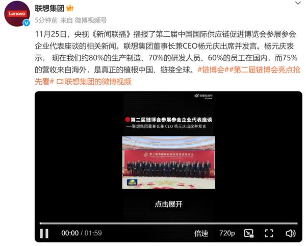 楊元慶在發言中表示,現在聯想約80%的生產制造、70%的研發人員、60%的員工在國內,而75%的營收來自海外,是真正的植根中國、鏈接全球。而在此前的鏈博會接受采訪時,楊元慶也談到了供應鏈對于聯想發展的重要性。他表示,維護全球產業鏈、供應鏈的韌性和穩定,是促進經濟發展,助力發展成果更好地惠及各國人民的重要保障。感謝中國促貿會在全球產業鏈、供應鏈加速面向數字化、綠色化發展的重要節點,為中外企業搭建了這樣一個國際化交流的合作平臺。這對打造更穩定、更智能、更可持續發展的全球供應鏈體系至關重要。