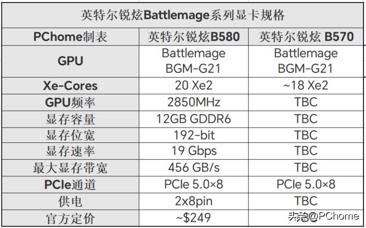 結合此前的爆料來看,銳炫B580擁有160個計算單元,即20個Xe核心,頻率為2850MHz,顯存方面配備12GB 192bit 19Gbps GDDR6顯存,顯存帶寬為456GB/s,采用PCIe 5.0x8接口,雙8pin供電,定價可能為249美元(約合人民幣1805元)。而定位更低的銳炫B570目前尚未有更多爆料,可能在核心數量以及顯存上有著進一步閹割。