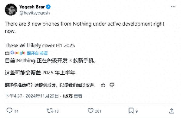 11 月 30 日消息,消息源 Yogesh Brar 昨日(11 月 29 日)在 X 平臺發(fā)布推文,曝料稱 Nothing 正研發(fā) 3 款智能手機(jī),可能會在 2025 年上半年推出。