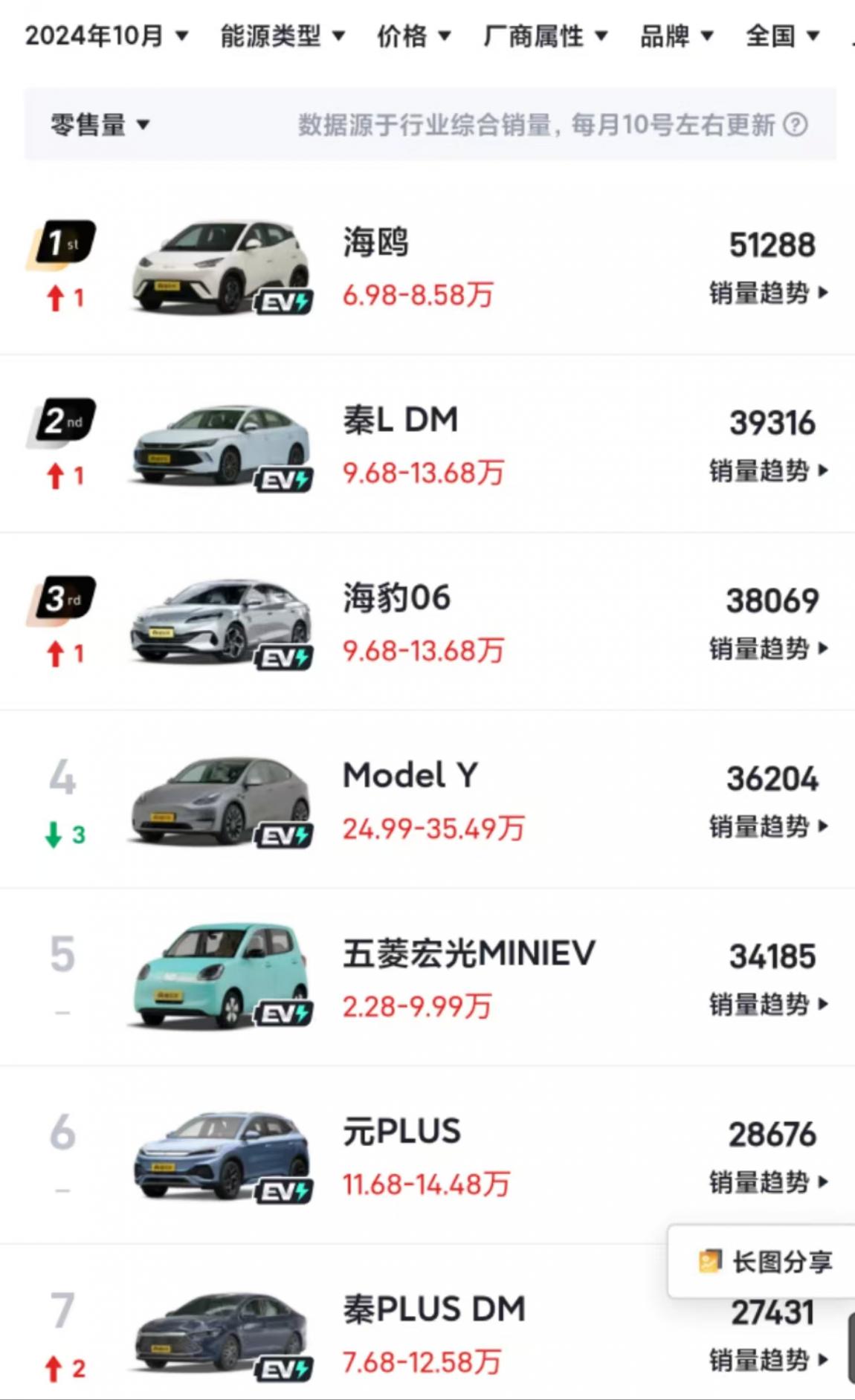 雖然12月份的榜單還沒有更新,但是對比整個年度的新能源汽車的銷量來看,海鷗能不能拿下年度冠軍就看12月的銷量了,對比10月份的銷量,第二名是秦L DM,第三名是海豹06,都是自家兄弟,這三兄弟霸榜前三,不過對比海鷗的銷量,可以說斷崖式領先其他車型,將近拉開一萬輛的差距
