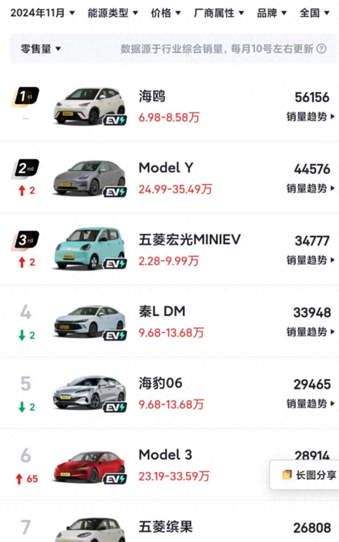 但是對比整個2024年度,Model Y要領先海鷗32632輛,冠軍最后花落誰家還不一定,等12月的新能源汽車銷量排行榜一出就能得知結果了