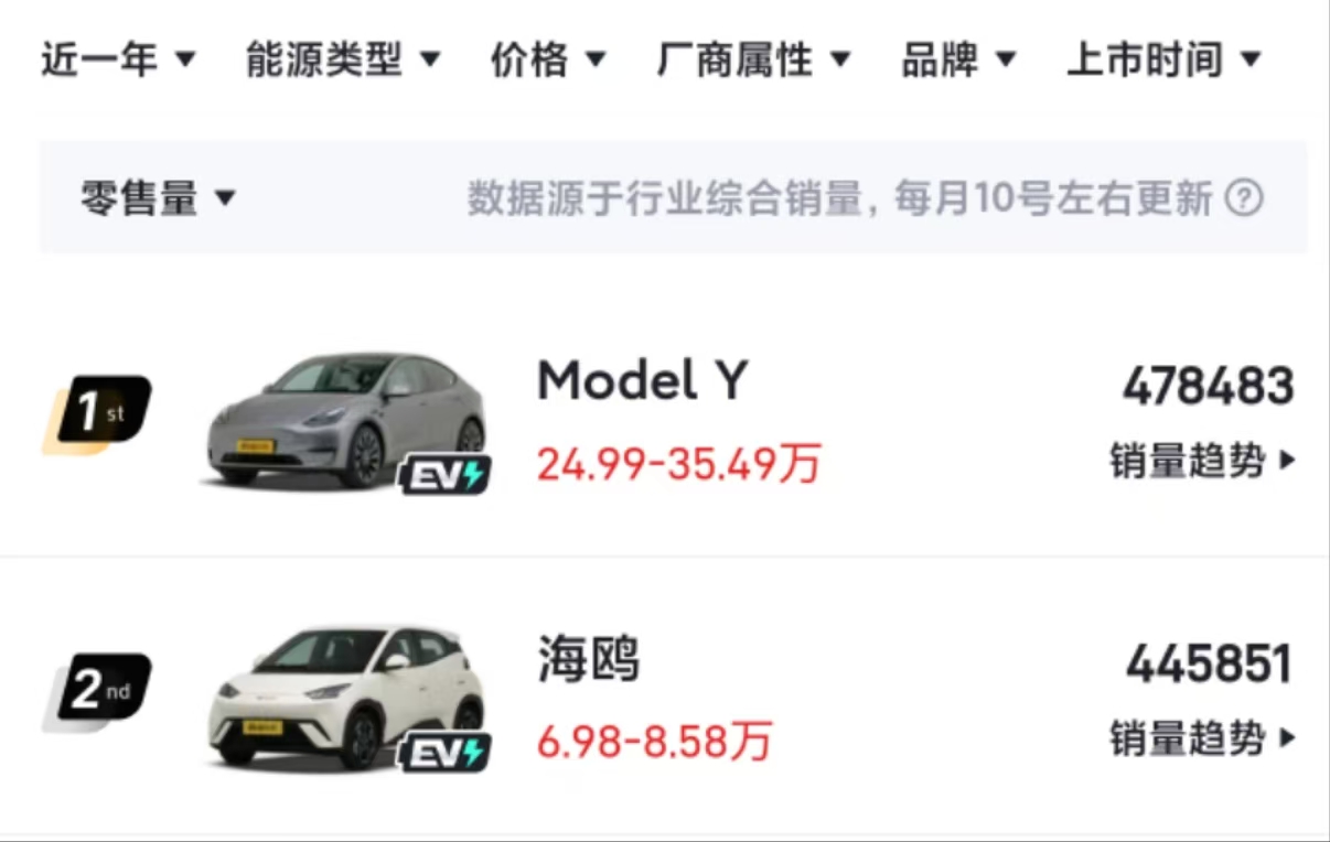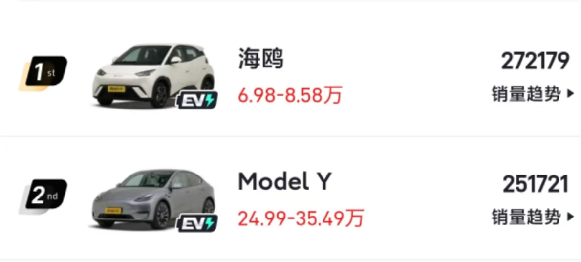 近半年時間內,海鷗和特斯拉Model Y的較量一直沒停過,下半年海鷗的銷量雖然比特斯拉高,但兩個車型幾乎都在2.6萬輛上下浮動