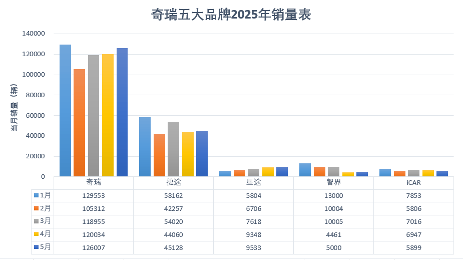 分品牌來看,5月,奇瑞品牌銷售汽車126,007輛,星途品牌銷售汽車9,533輛,捷途品牌銷售汽車45,128輛,iCAR品牌銷售汽車5,899輛,智界品牌銷售汽車5,000輛。
