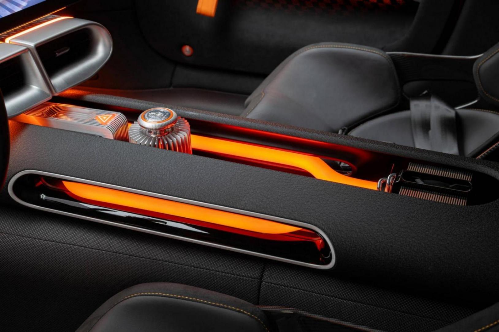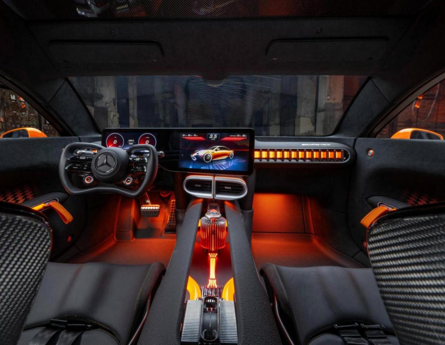 內飾方面,新車內飾極具未來科技感,中控臺、車門扶手等位置采用外露的白車身結構設計,以及碳纖維飾板、象征高壓電的橙色燈管點綴,駕駛欲十足。儀表臺的設計源自象征AMG靈魂的發動機缸體,表面飾有AMG徽章的浮雕。賽車風格方向盤與AMG ONE一脈相承,設有可調節能量回收等級的撥片和AMG操控單元。