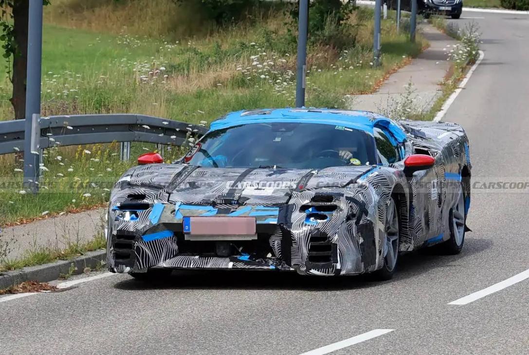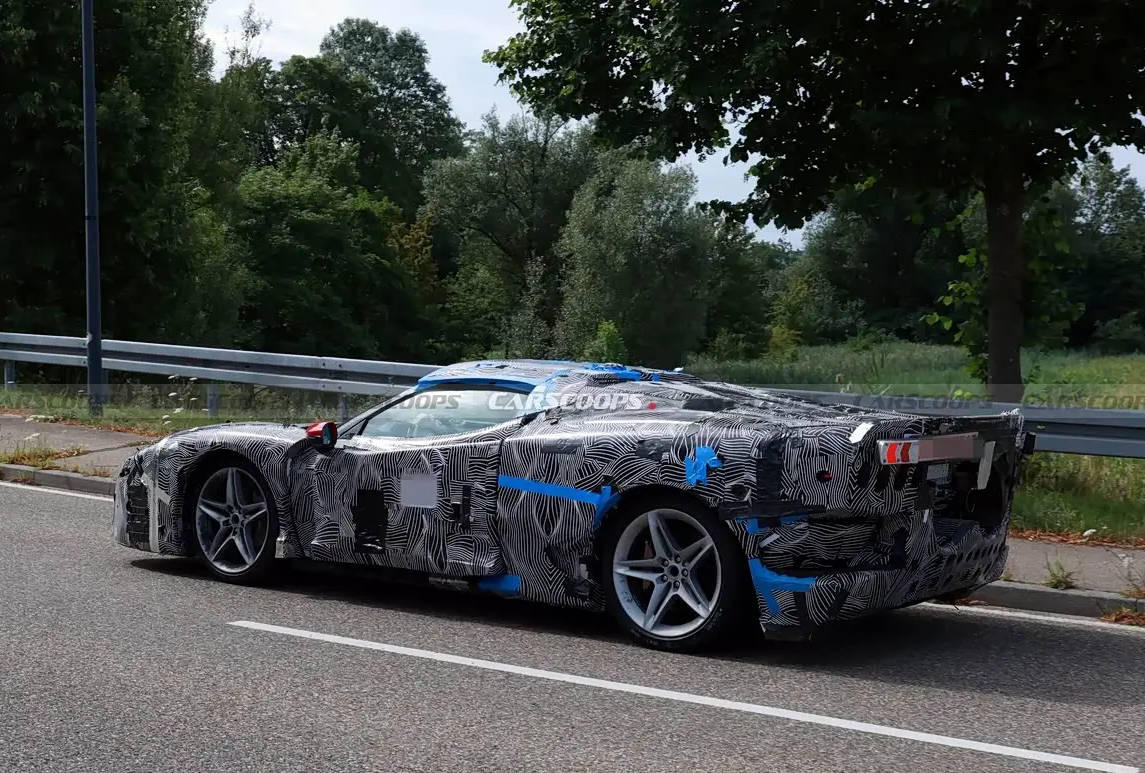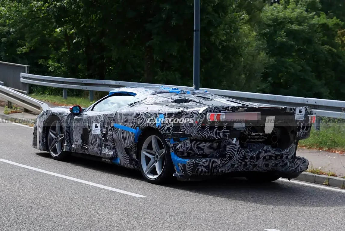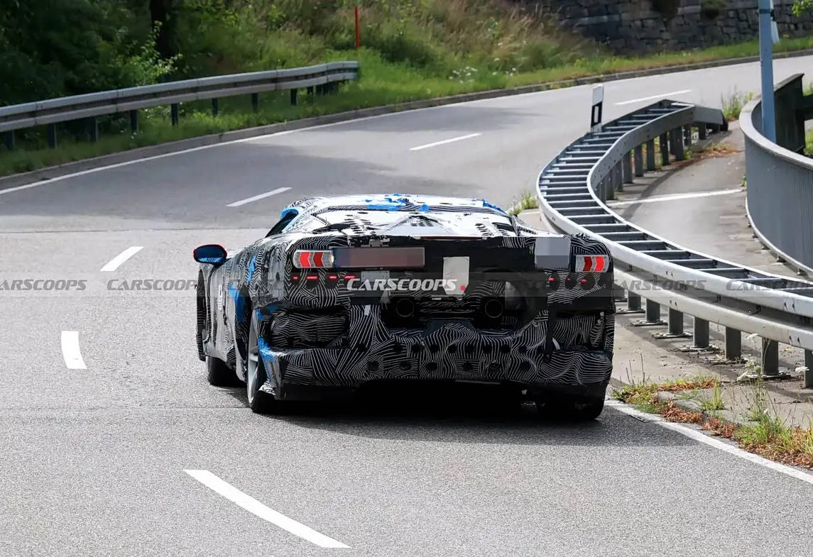 新車側面依舊是流暢的空氣動力學造型,車門處采用了鏤空的進氣口,風格依舊十分戰斗。不過目前車身上覆蓋有大量偽裝材質,還不能看清其細節造型。車尾方面,車輛的整體包圍造型十分夸張,采用中置雙出的排氣布局,預計也將采用全新的尾燈組。
