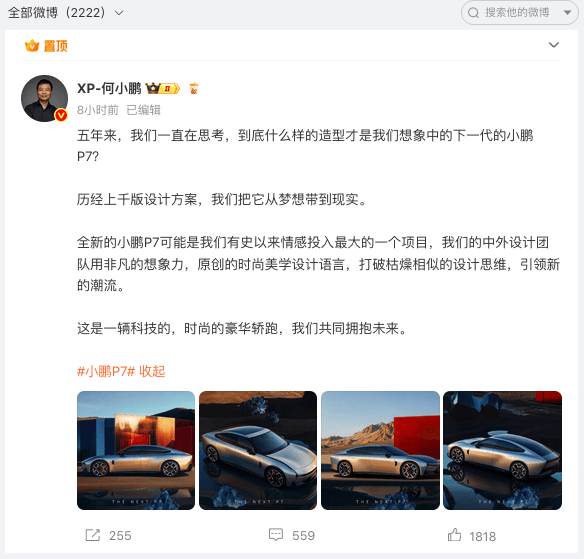 何小鵬微博置頂評價道:這是一臺時尚的豪華轎跑,我們的中外造型團隊用非凡的想象力,原創的時尚美學設計語言,打造了一輛「夢想之車」,顛覆想象,回到未來!