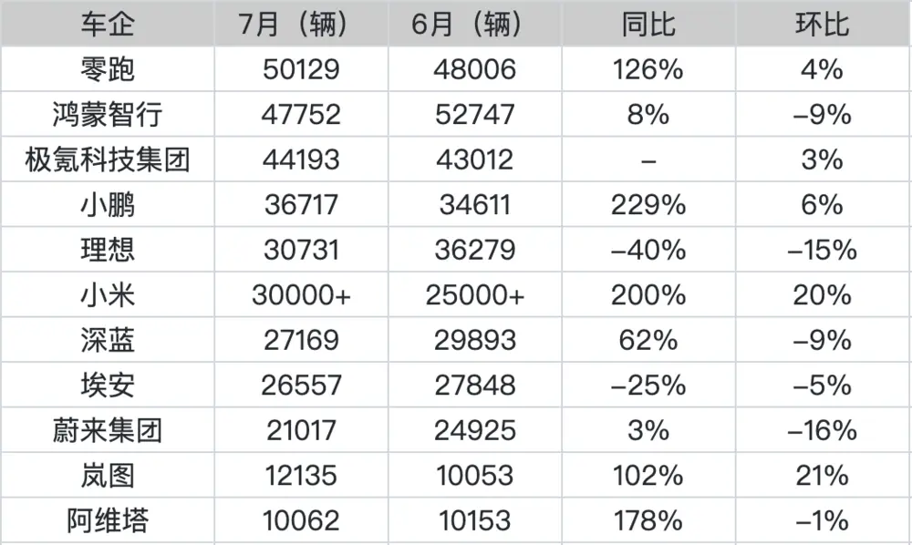 新能源汽車品牌7月數(shù)據(jù)如下——