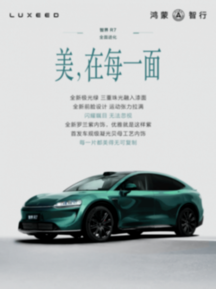 此次智界新款車型還推出極光綠全新配色,通過三重珠光漆疊加工藝,車身在不同光線下呈現天藍色-藍綠色-綠藍色的隨角異色效果,既呼應北歐極光的流動美感,又通過高閃爍質感傳遞運動基因。搭配鴻蒙智行家族化六邊框LOGO——中央「X」元素向四方延伸的留白設計,代表著智慧出行的無限可能。