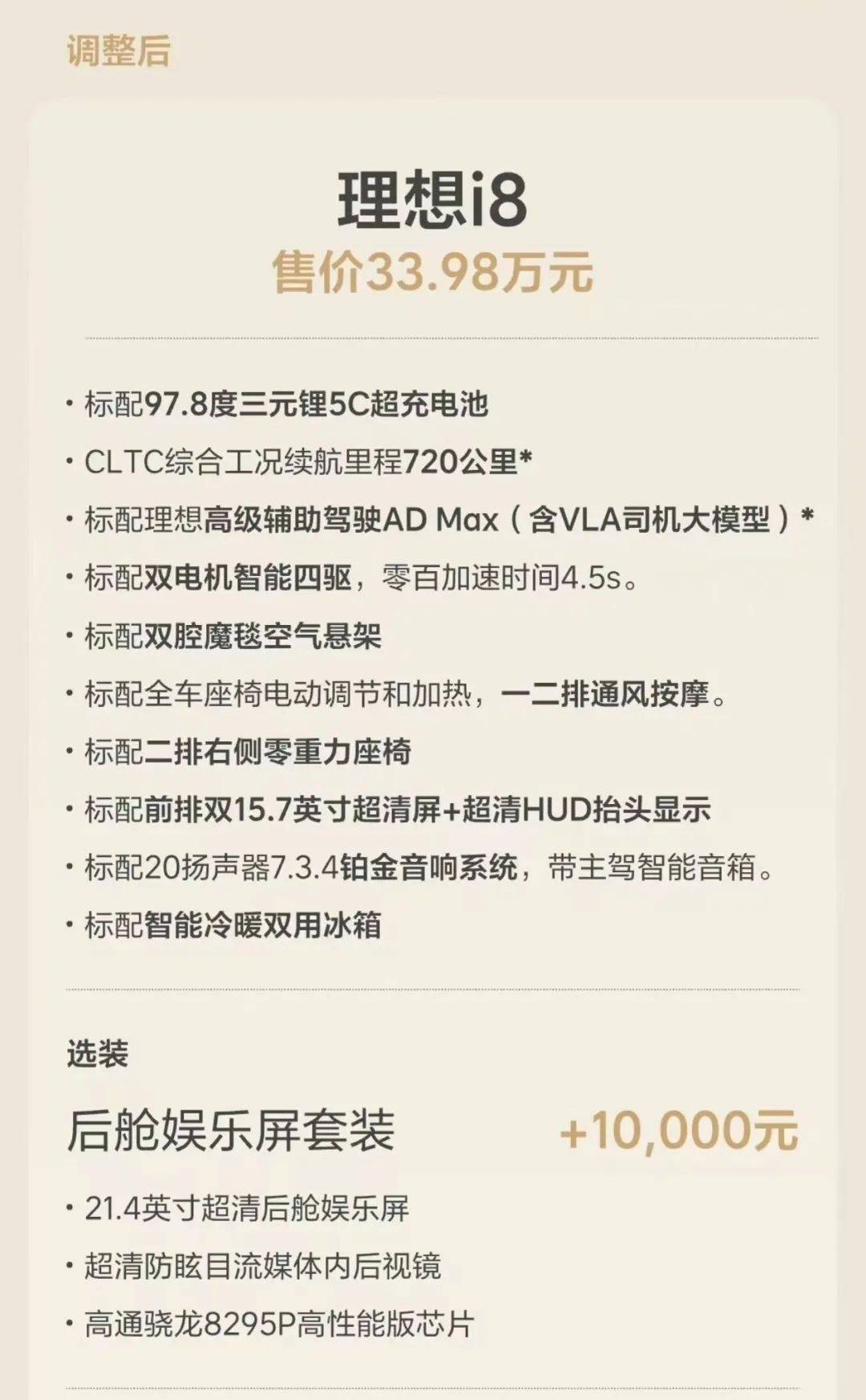 具體來看,取消多版本配置,統一為Max版本,并將用戶呼聲最高的“冰箱、彩電、大沙發”全面標配,同時下調價格至33.98萬元。