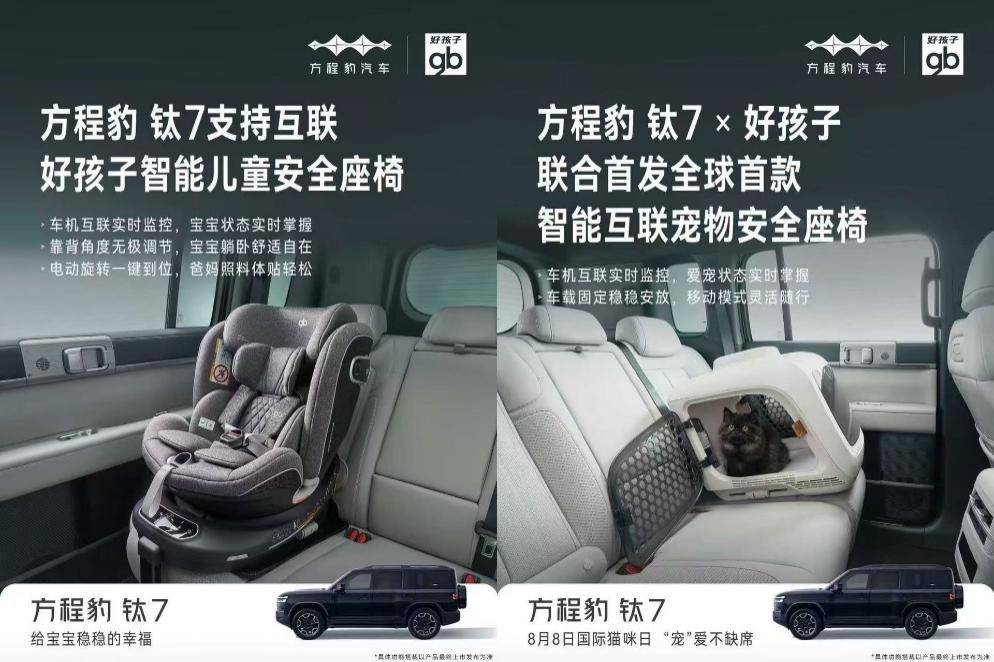 值得一提的是,鈦7近日又公布了首發首搭的比亞迪新一代智慧生態,并于8日當天還官宣了,方程豹品牌與gb好孩子聯合首發的鈦7智慧生態產品:智能兒童安全座椅、全球首款智能互聯寵物安全座椅,讓座艙體驗再升級,小孩子與毛孩子都一寵到底,預計后續鈦7將會有更多的座艙黑科技發布。