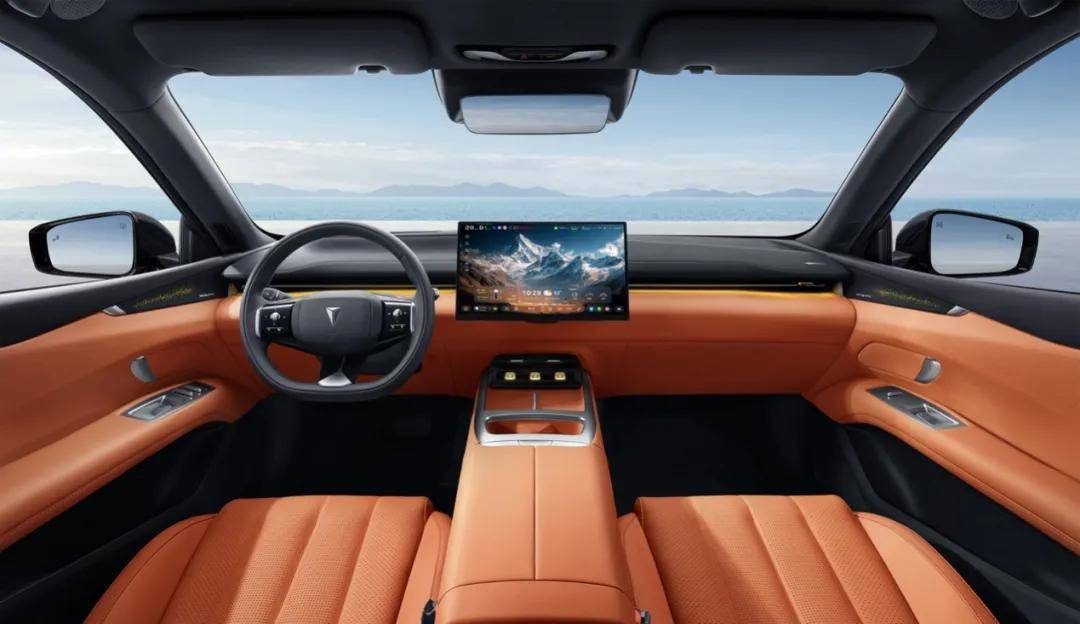 顏值這塊,深藍L07同樣拿捏得死死的。其設計不僅贏得了用戶眼球,還獲得了專業認可——斬獲2024-2025年度意大利A’設計獎金獎。動感的前臉,俯沖的車身姿態,加上懸浮躍光設計的車尾,運動感和科技感兼具。無框車門、1.9㎡超大Low-E高阻熱全景天幕(有效阻擋99%紫外線,隔熱率高達80%)、電動掀背門、以及能根據車速自動升降的電動尾翼(車速90km/h自動展開,170km/h時提供145N下壓力),這些提升格調和實用性的配置一個不少。純電版標配的19英寸颶風輪轂采用半封閉式設計,兼顧了美觀和降低風阻。車身上新增的輔助駕駛小藍燈是個貼心設計,能實時顯示車輛智駕狀態,提醒周圍車輛注意,提升道路協同安全性。內飾提供“星辰藍”等主題色及三種風格內飾配色(白調-海洋漂浮、橙調-落日飛行、黑調-時空探索),材質工藝上運用了環繞式膚感軟包、漸變親膚膜片、水晶通透裝飾件等,精致感和科技感并存。