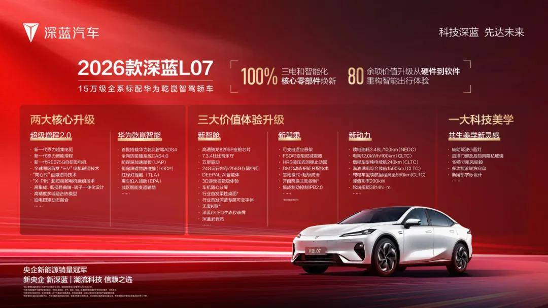 深藍L07的這次煥新上市,絕不僅僅是發布一款新車那么簡單。它更像是以“新央企·新深藍”為背書,通過實打實的技術突破——深藍超級增程2.0在能效上的極致追求,以及與頂級伙伴華為深度合作帶來的乾崑智駕ADS SE全系普及——精準地命中了用戶最核心的續航焦慮、智駕高成本門檻以及對高品質駕乘的追求。13.59萬起的親民價格,配上全系高階智駕、1500km的恐怖續航、越級的底盤行駛質感以及科技感與舒適感拉滿的座艙,深藍L07毫不客氣地在15萬級智能電動轎車領域樹起了一根新的“價值標桿”。