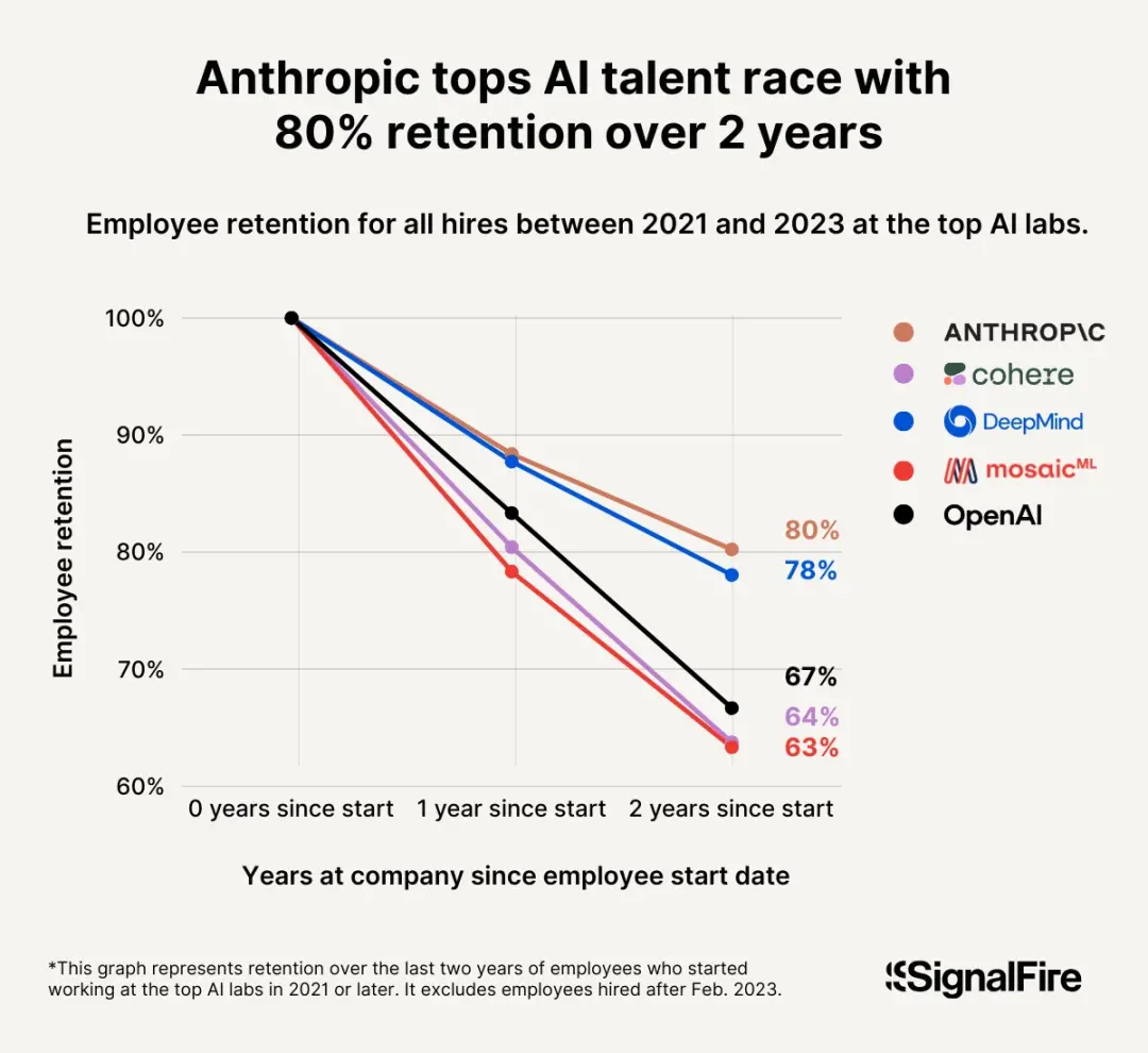 過去兩年,堅持不搞天價挖人的Anthropic員工保留率高達80%,而大手筆撒錢的Meta以及OpenAI只有64%。