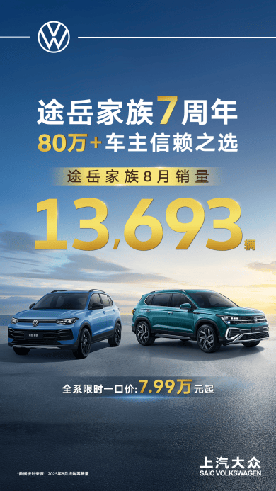 在上汽大眾的SUV產品矩陣中,途岳家族表現穩健,上市七周年累計收獲超80萬車主認可,其中,8月銷量達13,693輛,成為年輕家庭和首購用戶的可靠選擇。