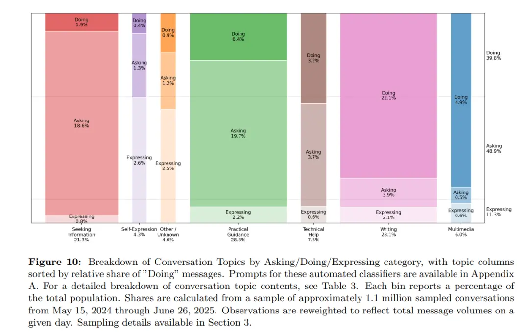 此外,人們使用ChatGPT的模式也可以分為三類:詢問(wèn)(Asking)、行動(dòng)(Doing)和表達(dá)(Expressing)。