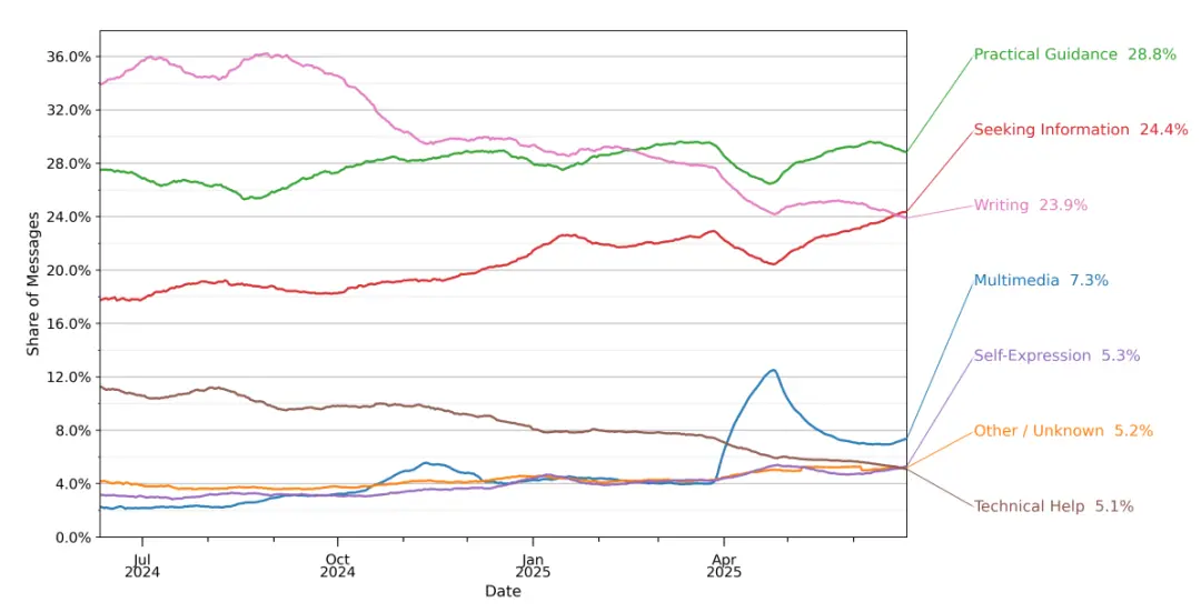 四分之三的對(duì)話側(cè)重于實(shí)用指導(dǎo)、信息搜索和寫(xiě)作。其中寫(xiě)作是最常見(jiàn)的工作任務(wù),而編程和自我表達(dá)仍然是小眾活動(dòng)。