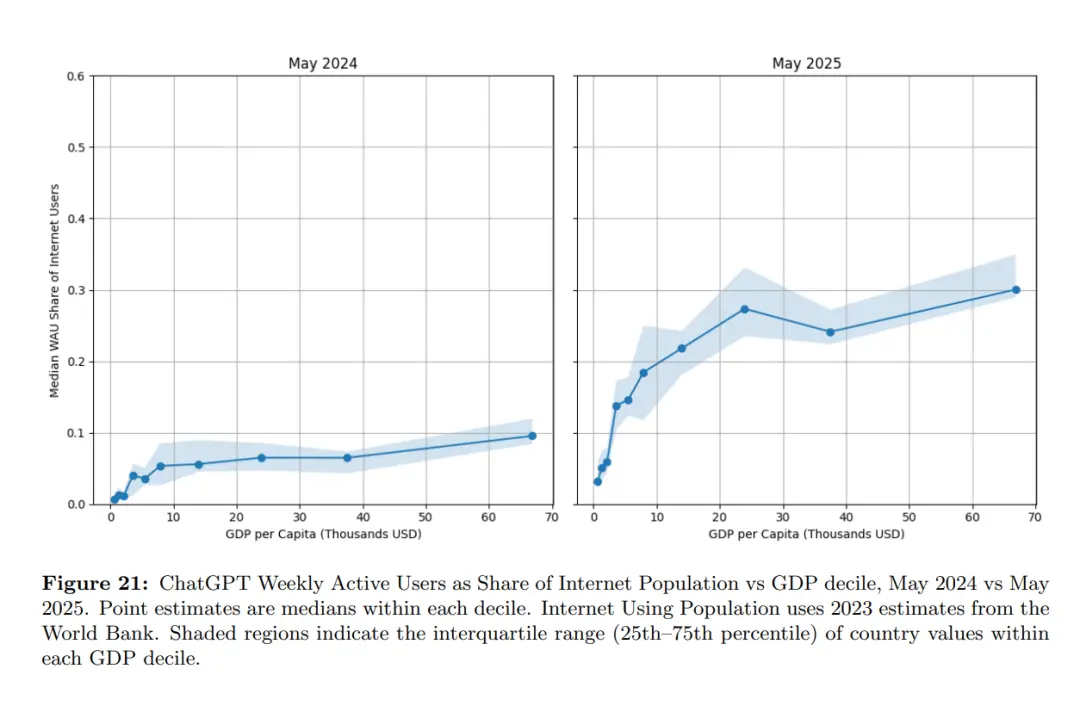 截至今年5月,ChatGPT在最低收入國(guó)家的使用增長(zhǎng)率是最高收入國(guó)家的4倍以上。