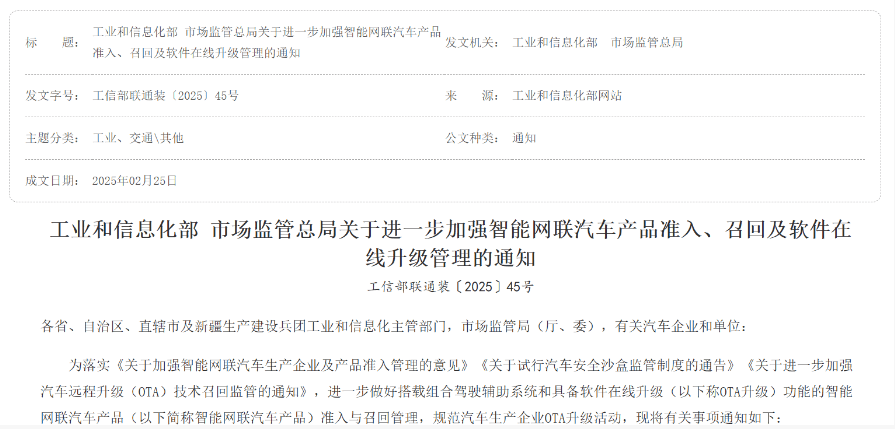 企業實施OTA升級活動,應當按要求向工業和信息化部、市場監管總局備案,并確保實施OTA升級活動后的汽車產品符合國家法律法規、技術標準及技術規范等相關要求。市場監管總局及時開展備案評估與監督檢查,規范OTA升級應用方式,避免企業通過OTA升級隱瞞車輛缺陷或規避責任。通知中也進行明確規定,強化OTA升級活動分類管理。
