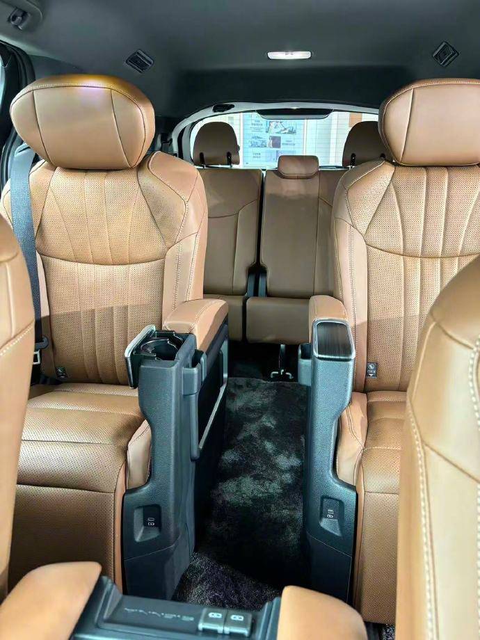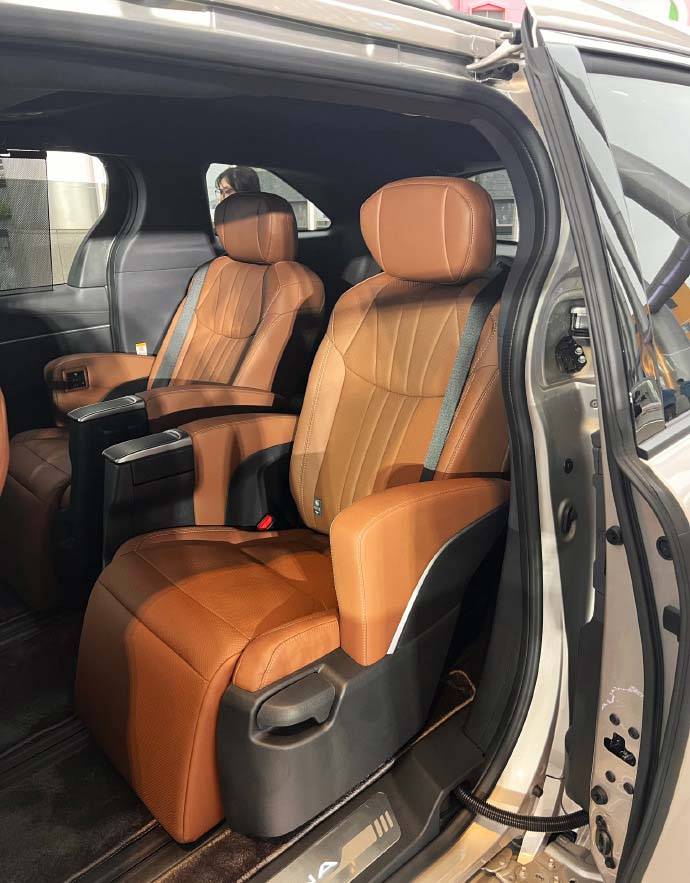 賽那二排空間在同級中屬于優秀,畢竟它底子就是一款燃油車,不用為底盤厚大的電池包侵占體積發愁。這次升級的兩張航空座椅,但中間過道依然寬敞,座椅還包含 16 點按摩、3 級通風、加熱和腿托多級調節,座椅用半苯胺真皮,這在日系車中很少見,在一款家用MPV 上更少見。