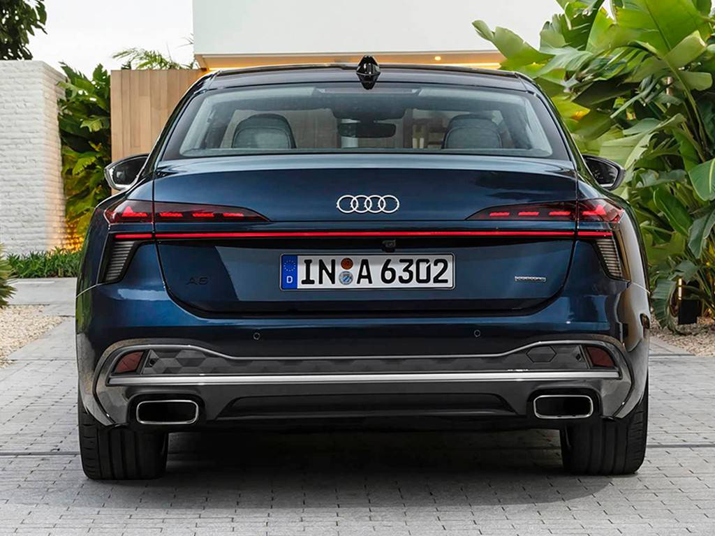 至于車尾部,國產版的全新奧迪A6L也和海外版A6一樣,同樣采用狹長的尾燈組,并在燈組下方加入亮黑的導流槽裝飾,形成分體式燈組的設計假象。同時,該車配備雙邊共兩出的排氣布局,下包圍也采用了更多的點陣式鍍鉻裝飾,以進一步提升運動感。