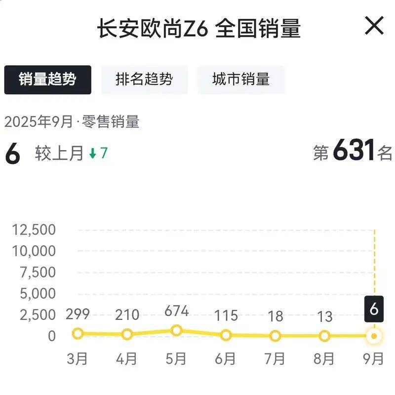 今年9月份,長安歐尚Z6的銷量為6輛,相比今年8月份的銷量13輛,環比下滑53.84%,相比去年9月份的銷量2504輛,同比下滑99.76%。同時,長安歐尚Z6自今年5月份開始,已經連續4個月出現環比下滑。