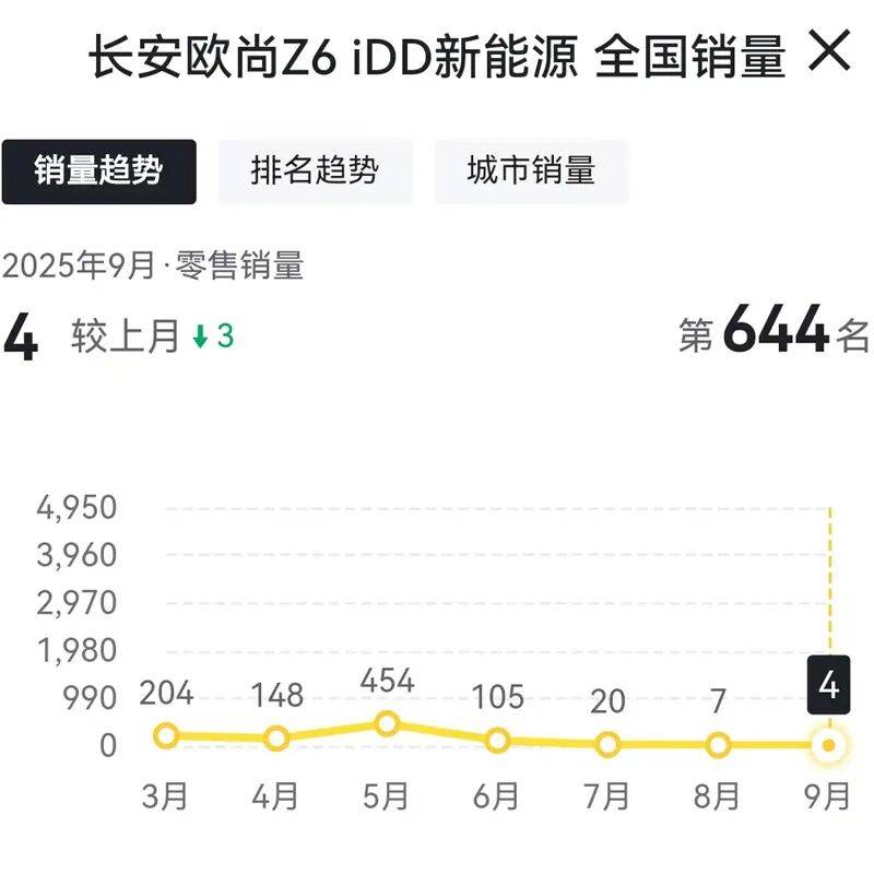 而長安歐尚Z6 iDD在9月份的銷量為4輛,相比今年8月份的銷量7輛,環比下滑42.85%,相比去年9月份的銷量830輛,同比下滑99.51%。同時,長安歐尚Z6 iDD自今年5月份開始,也已經連續4個月出現環比下滑。