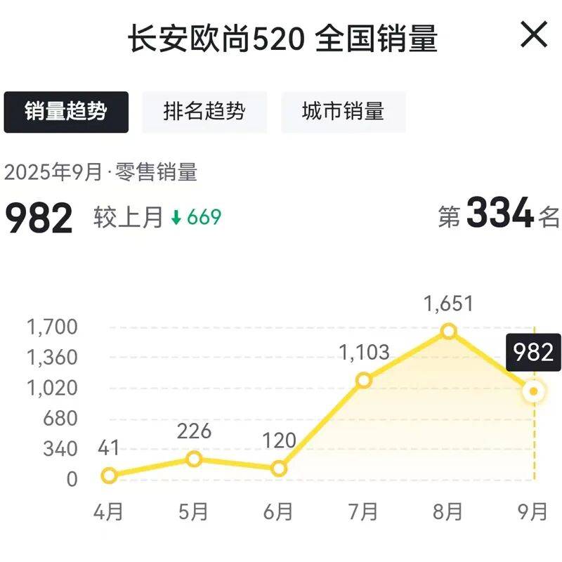 此外,長安歐尚的另外一款車型,長安歐尚520在9月份的銷量為982輛,相比今年8月份的銷量1651輛,環比下滑40.52%。