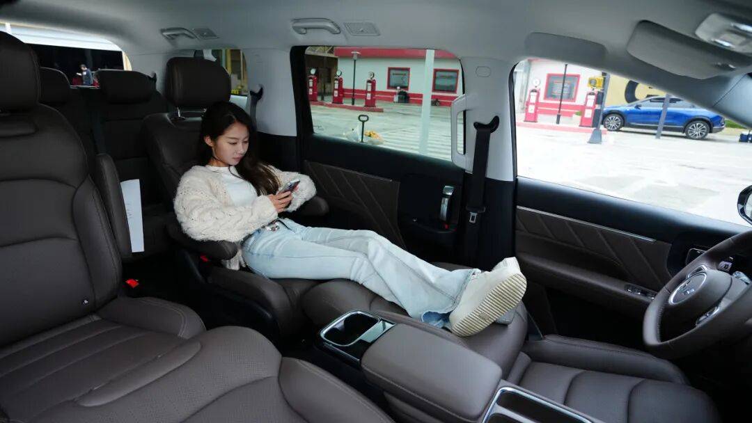 而我們今天體驗到的插混版采用懷擋設計,中央操縱臺為貫通式布局,配備無線充電面板、杯架與儲物槽,下方還設計有額外的儲物空間,實用性出色。此外第一排座椅可以180°放平,與第二排相連形成雙人床,顯著拓寬使用場景。