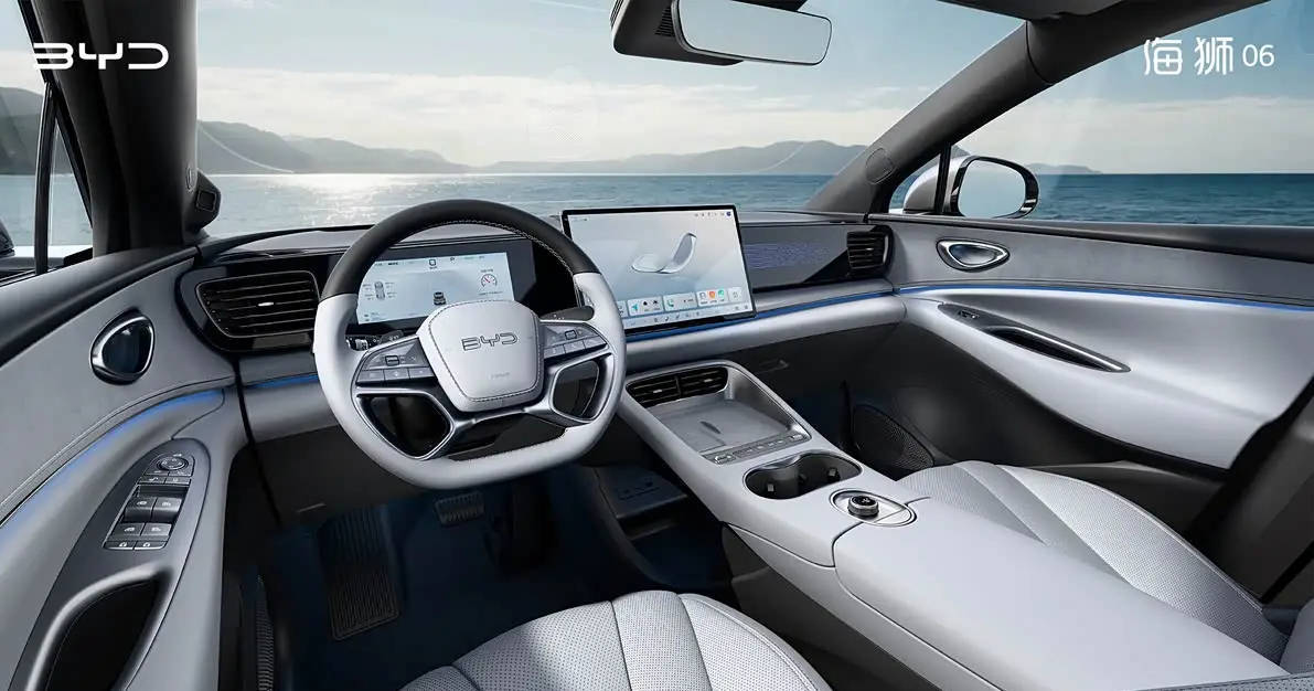 海獅06的內飾延續了比亞迪海洋系列的簡潔風格,采用柔和流暢的線條設計。中控臺層次分明,配備懸浮式液晶儀表盤和大尺寸中控屏,搭配四幅式飛魚仿生方向盤及懷擋設計,營造出科技感十足的座艙氛圍。中央扶手區保留了無線充電、啟動按鍵等常用物理按鍵,提升操作便利性。