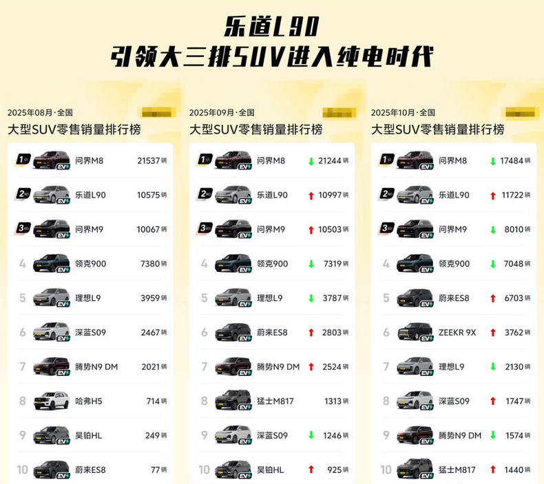 這哪是銷量爬坡?分明是踩著風火輪沖刺純電大型SUV的銷冠寶座!更關鍵的是,這兩款車已連續三個月蟬聯細分市場第一,硬生生把“高端純電賣不好”的黑子們一頓打臉。
