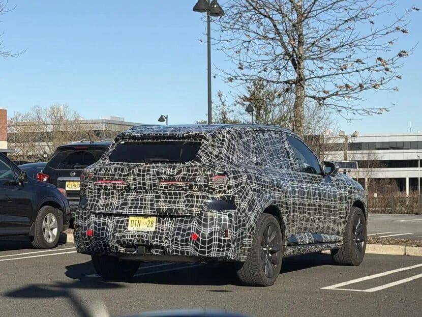 尾部方面,原型車向我們展示了尾燈設(shè)計(jì):燈組更寬,幾乎延伸至尾門中央,中間僅以一個(gè)經(jīng)過低調(diào)升級(jí)的寶馬圓形車標(biāo)分隔(與全新一代iX3首次采用的車標(biāo)相似)。測試車尾燈末端還呈現(xiàn)出兩個(gè)倒置的V形,讓人聯(lián)想到部分山脈輪廓。偽裝下隱約可見帶有垂直鰭片的運(yùn)動(dòng)型車頂擾流板。