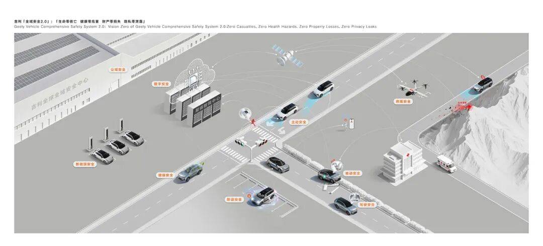 以往我們說安全,一般都是車身強度、傳感器數量等等。然而,如今的安全已經進化到了體系層面,吉利就提出 “全域安全2.0”體系。