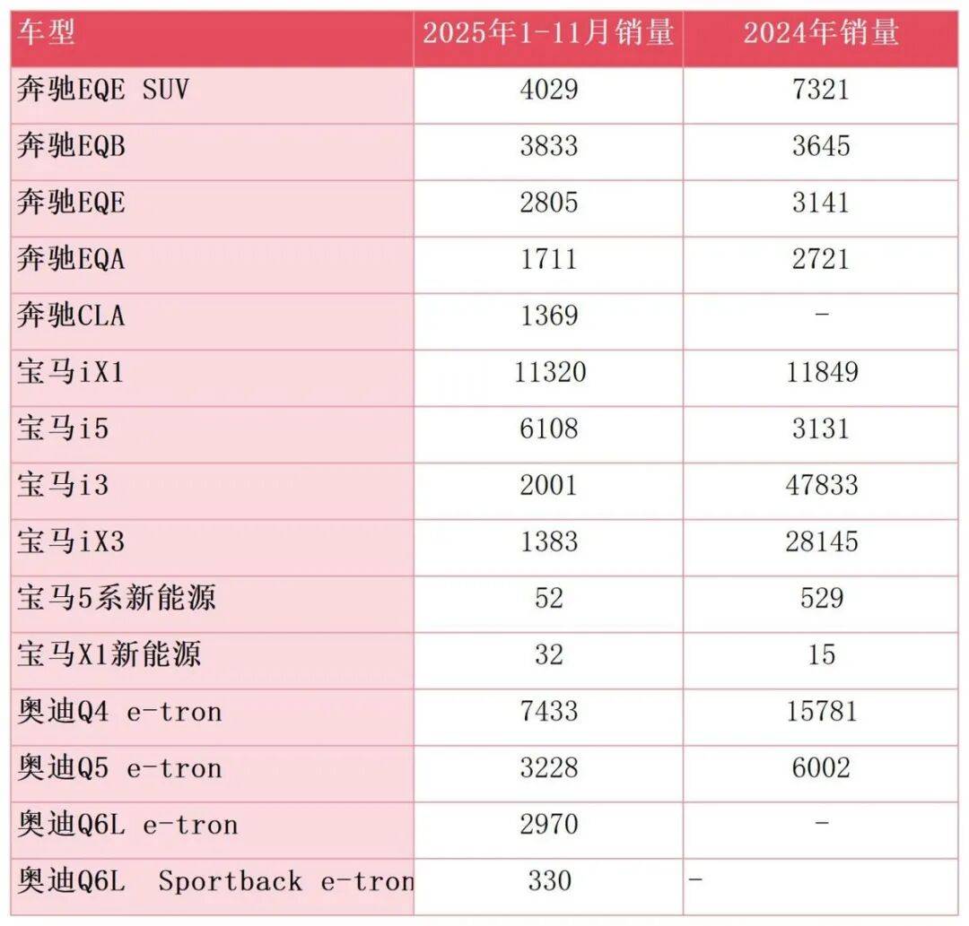 奔馳與奧迪的電動(dòng)化表現(xiàn)更是慘淡。2024年,奔馳全球新能源車(chē)型銷(xiāo)量共計(jì)36.76萬(wàn)輛,其中純電車(chē)型僅18.51萬(wàn)輛,同比大幅下滑23%;奧迪全年純電車(chē)型銷(xiāo)量?jī)H16.4萬(wàn)輛,深陷增長(zhǎng)停滯的泥沼。