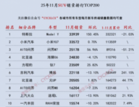 中高端車型成為SUV市場主力,特斯拉Model Y、小米YU7銷量均突破3萬輛,而小米YU7僅以不足400輛的微弱差距屈居亞軍。