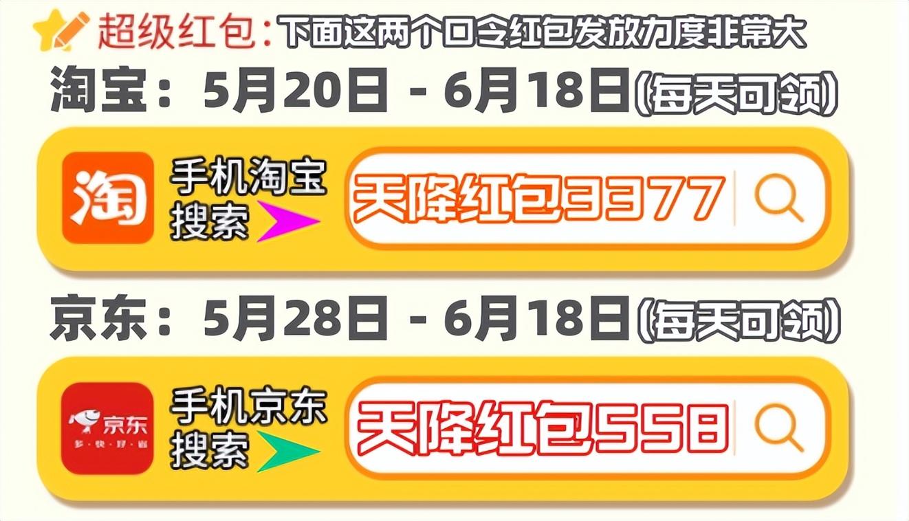 首先,劃重點!今年的淘寶618紅包口令是「天降紅包3377」,京東的618紅包口令是「天降紅包558」記得每天去領(lǐng),因為領(lǐng)的紅包大小和你搜索的什么口令有關(guān)哦!