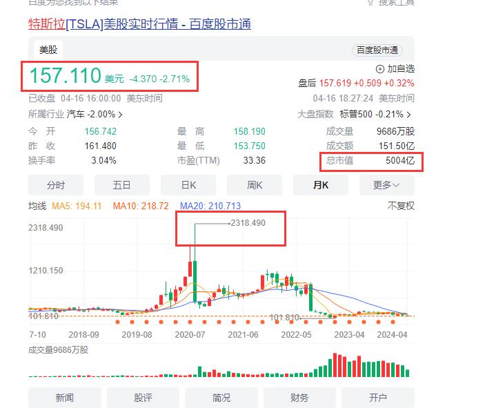 如果這些都不能證明的話,特斯拉的股價就最能證明的了,早在四年前,特斯拉的股價最高點一路來到了恐怖的2318.49美元,什么概念?那會的特斯拉股價已經差不多跟隔壁微軟和谷歌齊名了,可如今呢?特斯拉的股價一瀉千里,短短四年內,跌到只剩下157.11美元,而總市值已經只有5004億了,啥意思?大家都心知肚明了。
