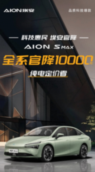 4 月 17 日消息,廣汽埃安今日官宣,AION S MAX 車型全系官降 1 萬元,現價 13.99 萬元起。