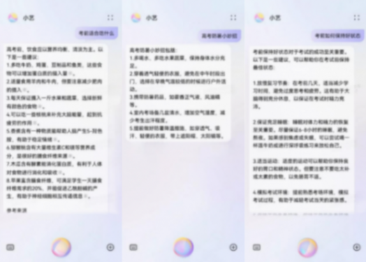 此外小藝也是幫助考生和家長輕松備考的好幫手,例如詢問“小藝,高考前感到焦慮怎么調(diào)整狀態(tài)?”小藝會快速提供建議,幫助考生調(diào)整心態(tài)。家長們也能通過小藝獲取備考建議,如“高考前家長可以做什么?”或“考生的營養(yǎng)餐怎么做?”此外,還可以問一些趣味性問題,如“高考為什么選擇6月7號和8號?”以緩解緊張氛圍。